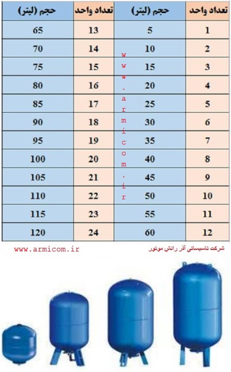 حجم منبع دیافراگمی جهت سیستم بوستر پمپ آبرسانی بر اساس تعداد واحد و با توجه به اختلاف شروع کار و اتمام کار یک دقیقه ای (delay time)، بر طبق جدول زیر به حضور اعلام می گردد، در صورت موجود نبودن آن اندازه در بازار، از بیشترین اندازه نزدیک به آن استفاده شود.